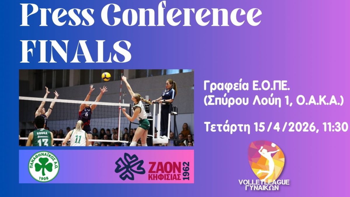 Την Τετάρτη 15 Απριλίου 2026 και ώρα 11:30, στα γραφεία της Ελληνικής Ομοσπονδίας Πετοσφαίρισης (Ε.Ο.ΠΕ.), θα πραγματοποιηθεί η επίσημη συνέντευξη Τύπου ενόψει των τελικών της Volley League Γυναικών. Στη συνέντευξη θα συμμετάσχουν οι προπονητές και οι αρχηγοί των δύο φιναλίστ ομάδων, του Παναθηναϊκού Α.Ο. και του Ζ.Α.Ο.Ν., οι οποίοι θα τοποθετηθούν για την επικείμενη σειρά των τελικών του πρωταθλήματος.