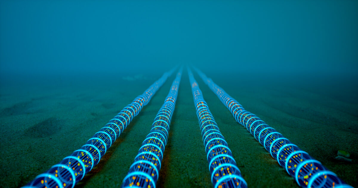 High-tech fiber optic cables glowing with blue light extend into the distance on the ocean floor, symbolizing global communication networks.