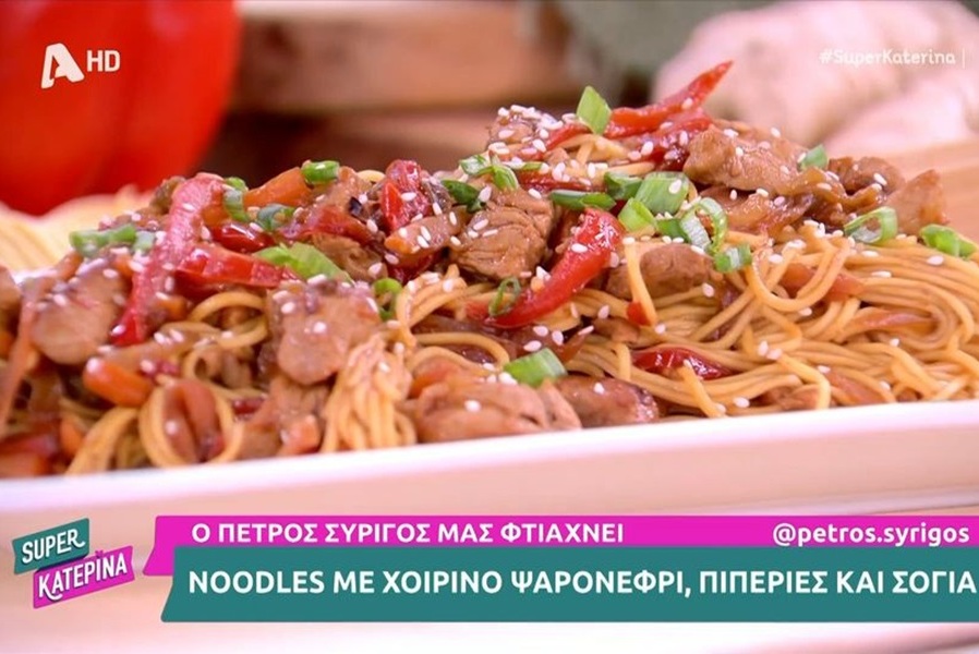 Ο Πέτρος Συρίγος ετοίμασε στην κουζίνα της εκπομπής «Super Κατερίνα» noodles με χοιρινό ψαρονέφρι, πιπεριές και σόγια! Για τη συνταγή θα χρειαστείτε: 2 κ.τ.σ. σάλτσα σόγιας 2 κ.τ.σ. κέτσαπ 2 κ.τ.σ. μέλι 1 κ.τ.σ. τριμμένο τζίντζερ 3 κ.τ.σ. ηλιέλαιο 1 σκ. σκόρδο 1 μέτριο λευκό κρεμμύδι 500 γρ. χοιρινό φιλέτο 1 αυγό 1 κ.σ. κορν […] , Περισσότερα…