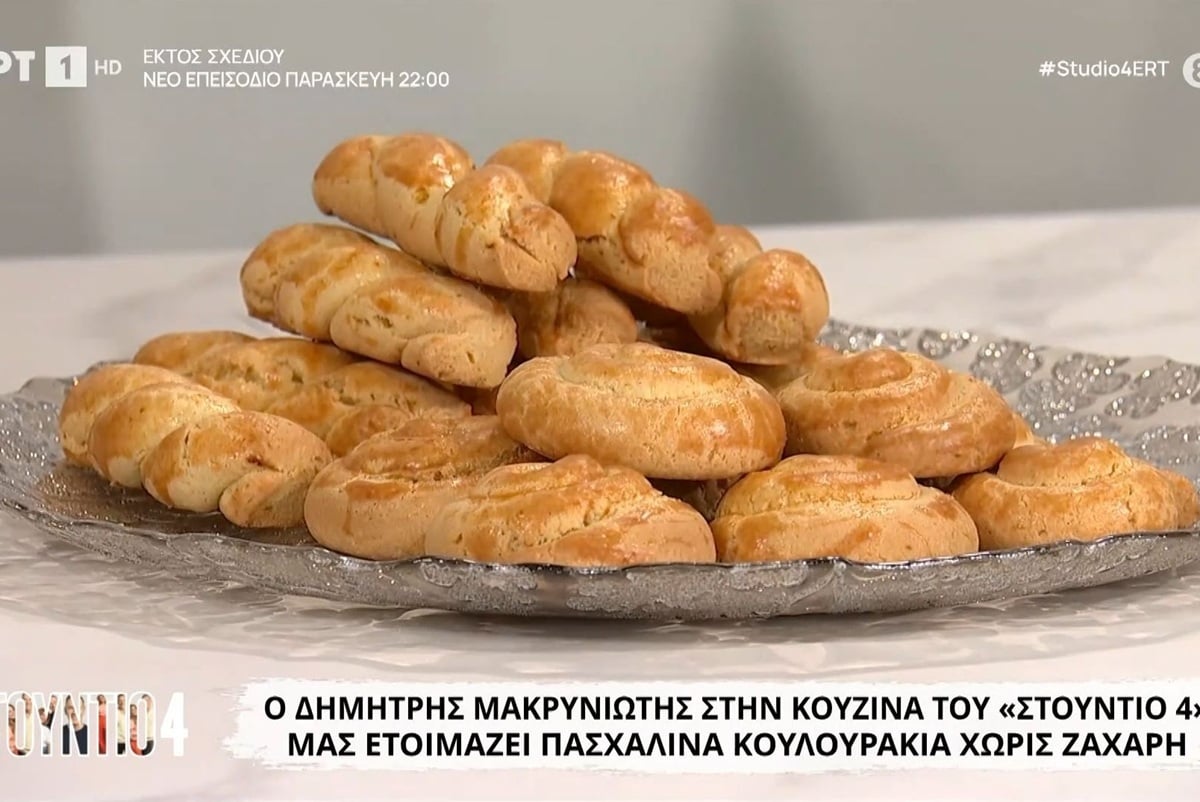 Ο Δημήτρης Μακρυνιώτης έφτιαξε πασχαλινά κουλουράκια χωρίς ζάχαρη στην κουζίνα της εκπομπής «Στούντιο 4». Δείτε τη συνταγή Υλικά: 250 γρ. βούτυρο αγελάδος 250 γρ. μέλι 2 κρόκους από μεσαία αβγά 1 κιλό αλεύρι μαλακό 1 κ.σ. μπέικιν πάουντερ 1 κ.γ. τριμμένη μαστίχα ξύσμα από 2 πορτοκάλια 40 ml κονιάκ 300 ml φρέσκο χυμό πορτοκάλι Για […] , Περισσότερα…